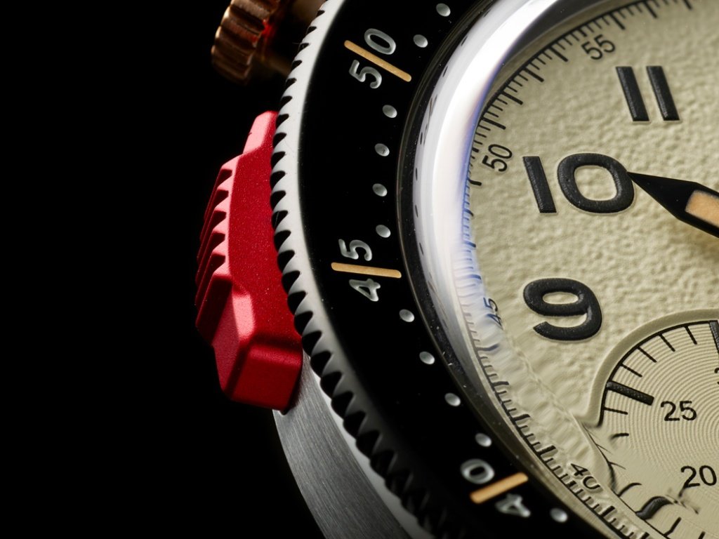 Το όμορφα ανάγλυφο καντράν ακολουθεί αυστηρά λειτουργικές αρχές. Οι μεγάλοι αραβικοί αριθμοί, η καθαρή αντίθεση και η ισορροπημένη διάταξη των υποκαντράν προσφέρουν άμεση αναγνωσιμότητα. Ο χρονογράφος είναι monopusher – ένα μόνο κουμπί που ελέγχει όλες τις λειτουργίες start, stop και reset. Το χαρακτηριστικό κόκκινο χρώμα του δεν αποτελεί αισθητική επιλογή, αλλά πρακτική αναφορά σε στρατιωτικούς χρονογράφους, όπου τα κρίσιμα χειριστήρια έπρεπε να εντοπίζονται άμεσα.