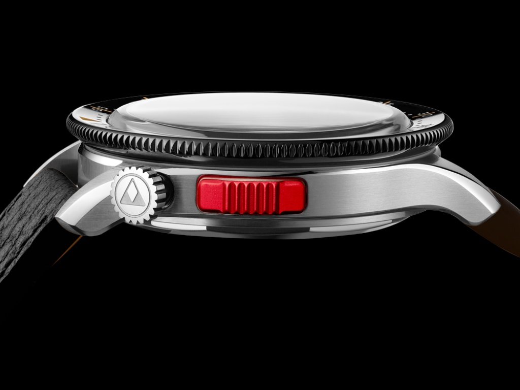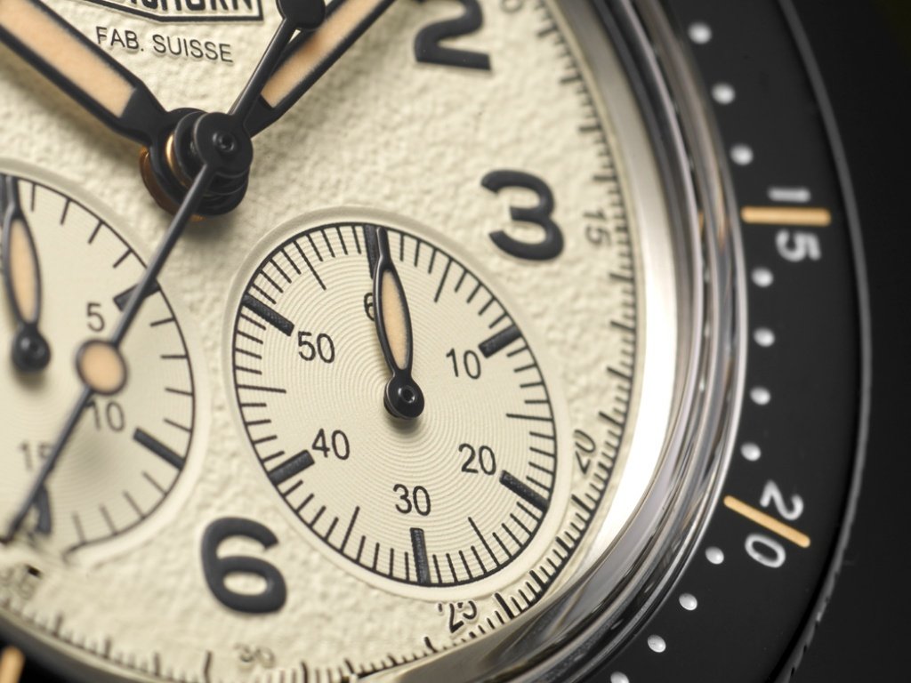 Το όμορφα ανάγλυφο καντράν ακολουθεί αυστηρά λειτουργικές αρχές. Οι μεγάλοι αραβικοί αριθμοί, η καθαρή αντίθεση και η ισορροπημένη διάταξη των υποκαντράν προσφέρουν άμεση αναγνωσιμότητα. Ο χρονογράφος είναι monopusher – ένα μόνο κουμπί που ελέγχει όλες τις λειτουργίες start, stop και reset. Το χαρακτηριστικό κόκκινο χρώμα του δεν αποτελεί αισθητική επιλογή, αλλά πρακτική αναφορά σε στρατιωτικούς χρονογράφους, όπου τα κρίσιμα χειριστήρια έπρεπε να εντοπίζονται άμεσα.