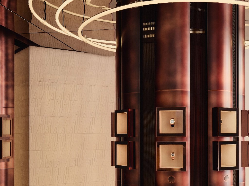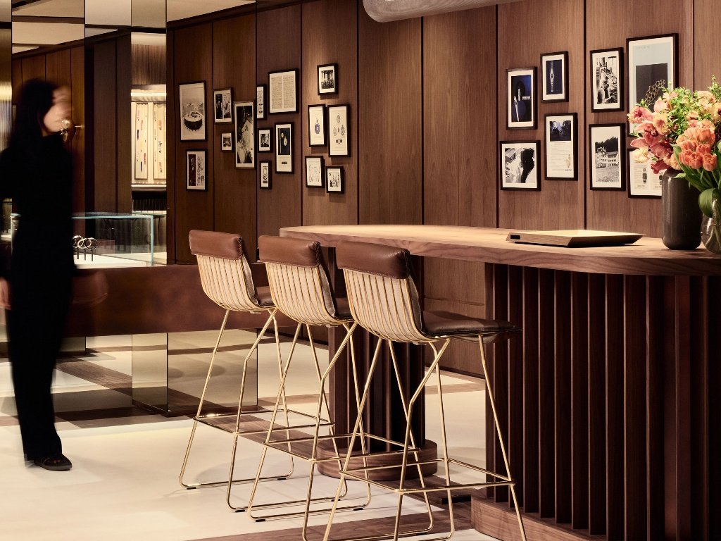 Στους επάνω ορόφους, η εμπειρία γίνεται ακόμη πιο οικεία. Ένας εντυπωσιακός χώρος παρουσίασης ρολογιών 360 μοιρών, συχνά αποκαλούμενος “κελάρι ρολογιών”, φιλοξενεί επιλεγμένα μοντέλα της μάρκας σε μια επιβλητική βιτρίνα από γυαλισμένο χαλκό που εκτείνεται από το δάπεδο μέχρι την οροφή.