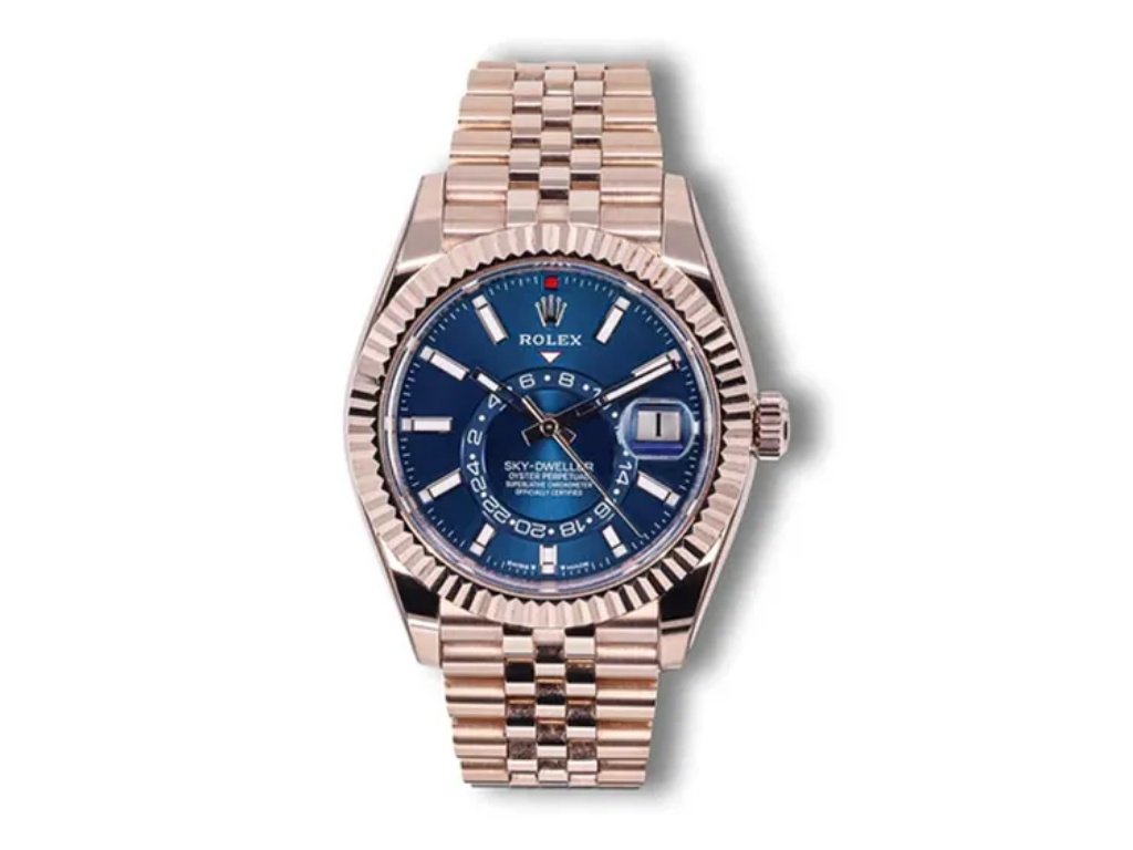 Στον ίδιο κόσμο ανήκει και το Rolex Sky-Dweller από ροζ χρυσό, ένα από τα πιο πολύπλοκα ρολόγια που έχει δημιουργήσει η εταιρεία τα τελευταία χρόνια, σχεδιασμένο για ανθρώπους που ταξιδεύουν συνεχώς και χρειάζονται δύο ζώνες ώρας και ετήσιο ημερολόγιο σε ένα ενιαίο, κομψό σύνολο.
