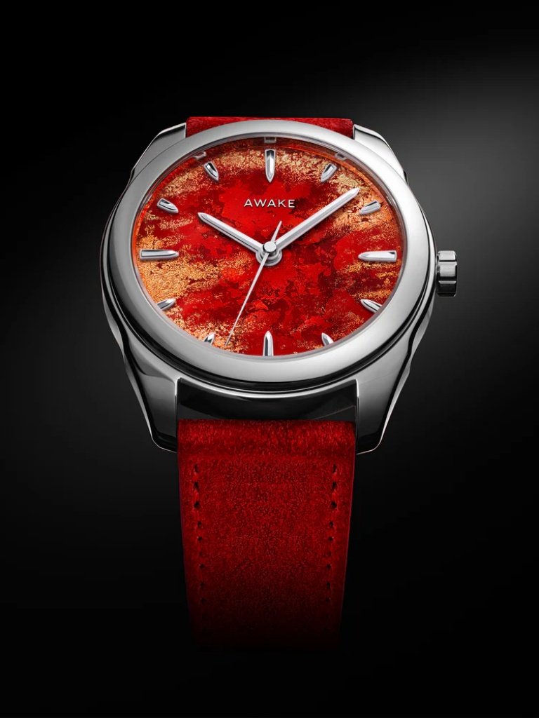 Σε συνδυασμό με ένα κόκκινο σουέτ λουράκι από δέρμα μοσχαριού, χειροποίητο στη Γαλλία, η έκδοση “Royal Red” είναι διαθέσιμη μέσω της Awake στην τιμή των 2.728 ευρώ.