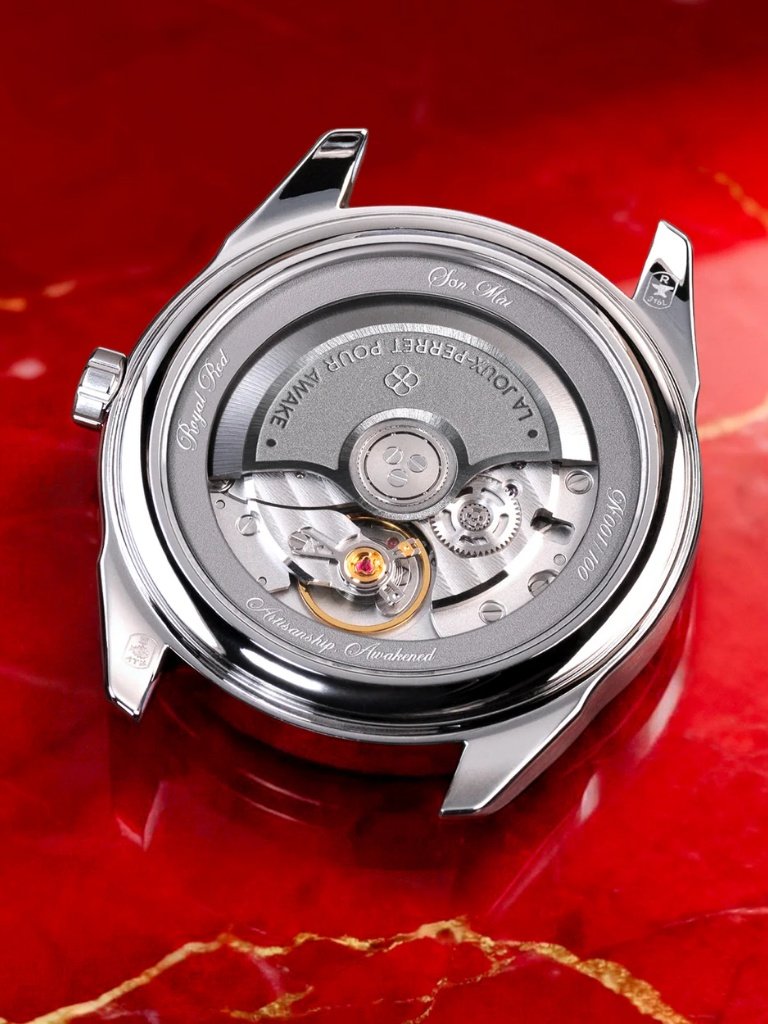 Σε αυτό το πνεύμα, η μάρκα επεκτείνει τη σειρά Frosted Leaf με το Son Mài – Frosted Leaf “Royal Red”, μια περιορισμένη έκδοση μόλις 100 τεμαχίων. Εμπνευσμένο από αρχαία ασιατικά τελετουργικά αντικείμενα, το ρολόι λειτουργεί ως ένα αληθινό “δοχείο πολιτισμών”, συνδυάζοντας τη σύγχρονη ωρολογοποιία με την παραδοσιακή βιετναμέζικη τέχνη λακαρίσματος Sơn Mài.