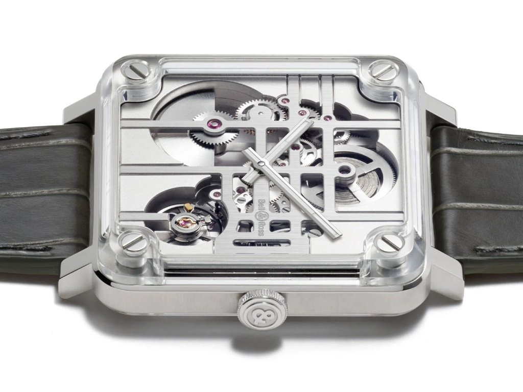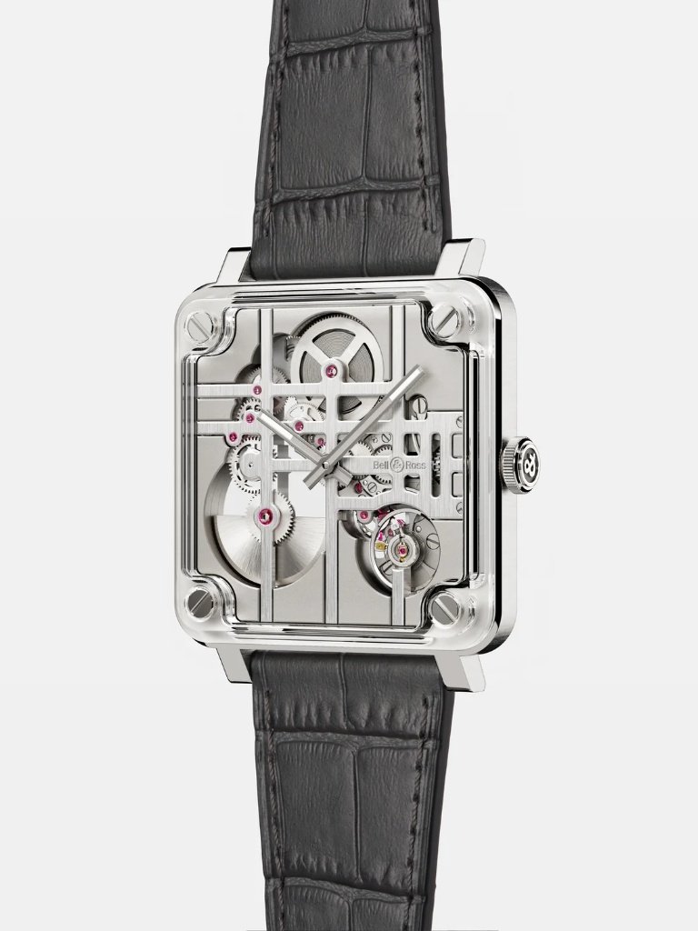 Η κάσα από ατσάλι των 40mm, με σατινέ και γυαλισμένες επιφάνειες, ακολουθεί την εμβληματική τετράγωνη σχεδίαση της σειράς BR-03, με τις τέσσερις χαρακτηριστικές βίδες. Σε αυτό το μοντέλο κάσα και μηχανισμός συνυπάρχουν ως μία ενιαία δομή, με την κεντρική πλάκα να λειτουργεί ταυτόχρονα ως βάση και ως δομικό στοιχείο. Οι κρύσταλλοι σαπφείρου στο μπροστινό και πίσω μέρος εξασφαλίζουν ανεμπόδιστη θέα σε κάθε λεπτομέρεια.