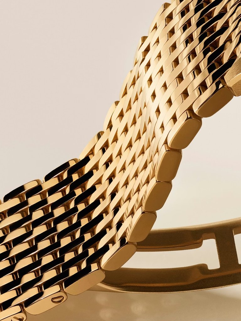 Ιδιαίτερη σημασία έχει και η εισαγωγή ενός νέου μπρασελέ από πολύτιμα μέταλλα, το οποίο αντλεί έμπνευση από τα μπρασελέ κατά παραγγελία που δημιουργούσε ο οίκος τη δεκαετία του 1920. Το εναλλάξιμο mesh μπρασελέ αποτελείται από σειρές μικροσκοπικών κρίκων, συνολικά 394, με διάμετρο μόλις 1,15mm ο καθένας, δημιουργώντας μια εξαιρετικά ρευστή και εκλεπτυσμένη αίσθηση στον καρπό. Το κρυφό πτυσσόμενο κούμπωμα ενισχύει τη μινιμαλιστική προσέγγιση, ενώ η συνολική κατασκευή προσδίδει στο ρολόι ένα πιο αεροδυναμικό προφίλ.