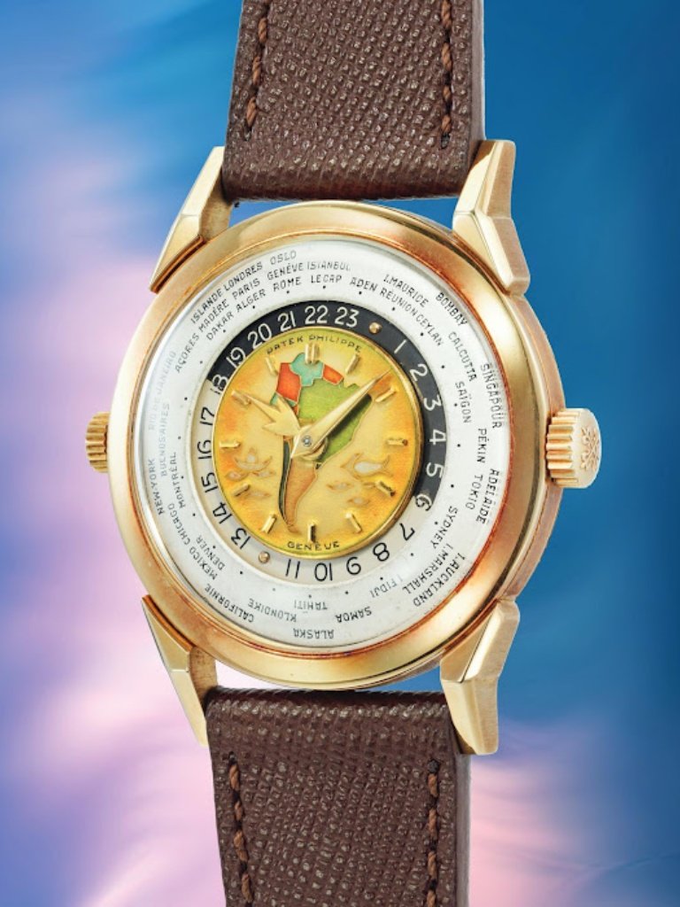 Το απόλυτο highlight της δημοπρασίας είναι ένα εξαιρετικά σπάνιο Patek Philippe Ref. 2523 two-crown world-time του 1953. Ξεχωρίζει για το πολύχρωμο καντράν από cloisonné σμάλτο, το οποίο απεικονίζει τον χάρτη της Νότιας Αμερικής. Στεγασμένο σε κάσα από κίτρινο χρυσό 18 καρατίων, αποτελεί ένα από τα μόλις δύο γνωστά παραδείγματα με αυτή τη διαμόρφωση καντράν και δεν έχει εμφανιστεί δημόσια σε δημοπρασία για σχεδόν τέσσερις δεκαετίες. Η εκτίμησή του ανέρχεται στα 5.450.000 ευρώ.
