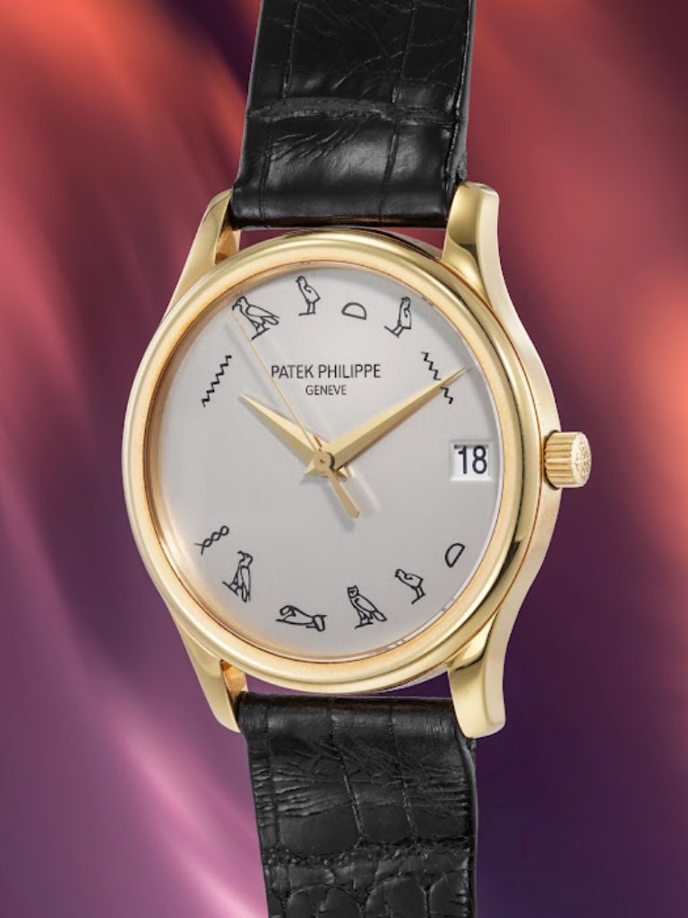 Ένα ακόμη αξιοσημείωτο ρολόι της Patek Philippe είναι το Ref. 3998J-013, ένα μοντέλο Calatrava που κατασκευάστηκε το 2002. Διαθέτει ένα εξαιρετικά ασυνήθιστο καντράν, όπου οι ενδείξεις της ώρας αποδίδονται με αιγυπτιακούς ιερογλυφικούς χαρακτήρες. Πρόκειται για ένα από τα τέσσερα μόνο γνωστά παραδείγματα, όλα παραγγελθέντα από τον ίδιο συλλέκτη, με διαφορετικές επιγραφές. Το συγκεκριμένο φέρει την ένδειξη «HALMUT NAUTUN» – αποδοσμένη σε διακοσμητική και όχι αυστηρά γλωσσολογική μορφή μέσω των ιερογλυφικών συμβόλων – και πιθανότατα προοριζόταν ως δώρο για τον Helmut Newton. Η εκτιμώμενη τιμή του κυμαίνεται μεταξύ 87.200 και 174.000 ευρώ.