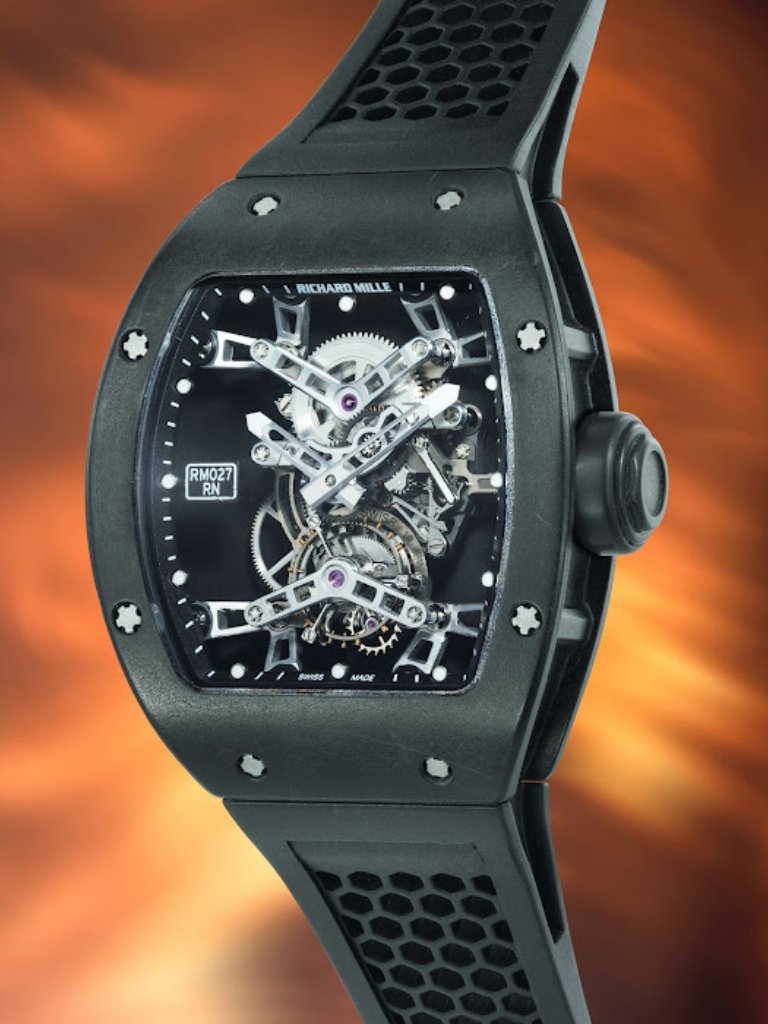 Τέλος, στη δημοπρασία περιλαμβάνεται και το Richard Mille RM 027 Tourbillon Nadal, το οποίο παρουσιάστηκε το 2010 σε συνεργασία με τον Rafael Nadal. Σχεδιασμένο για χρήση σε επαγγελματικούς αγώνες τένις, το ρολόι ζυγίζει λιγότερο από 20 γραμμάρια μαζί με το λουράκι και διαθέτει χειροκίνητο μηχανισμό tourbillon, ο οποίος αιωρείται μέσα στην κάσα μέσω ενός συστήματος τεντωμένων καλωδίων. Το συγκεκριμένο κομμάτι, με αριθμό 25 από τα συνολικά 50 που κατασκευάστηκαν, εκτιμάται στα 545.000 – 1.090.000 ευρώ.
