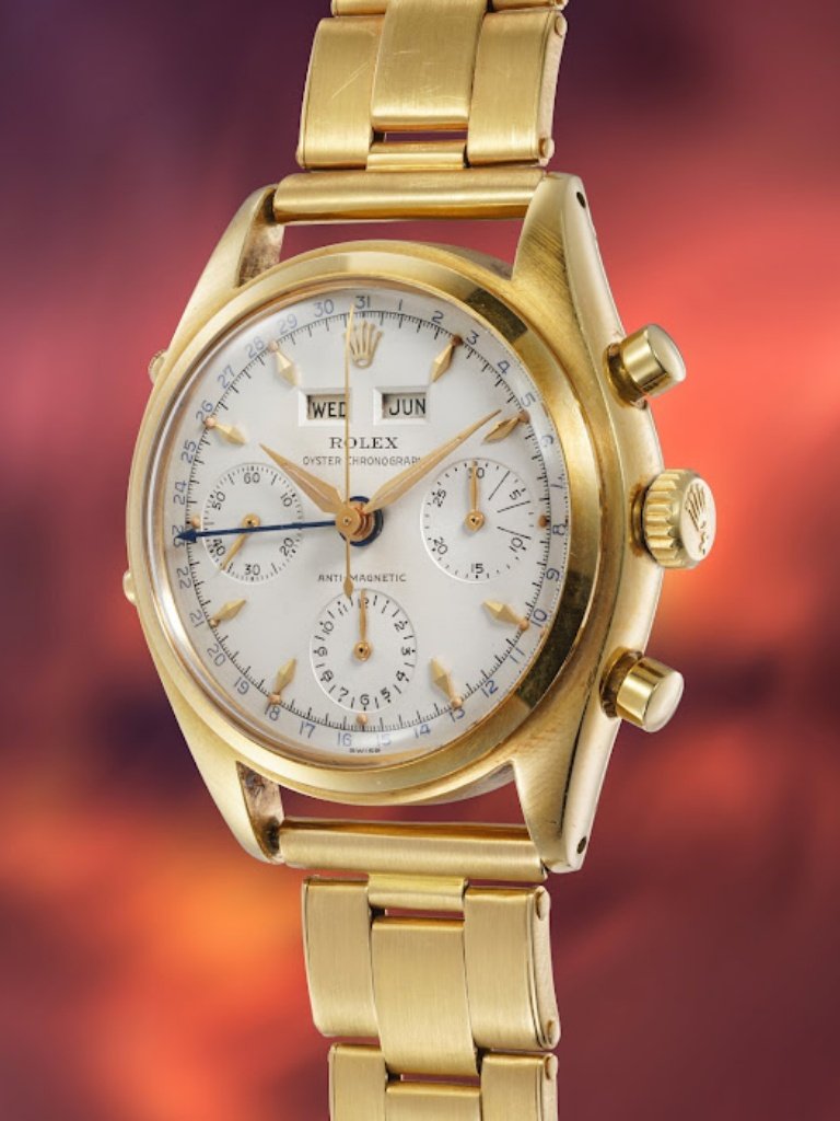 Οι συλλέκτες vintage Rolex θα ξεχωρίσουν το Ref. 6036, γνωστό ως “Datocompax Killy”, το οποίο παρουσιάστηκε το 1951 ως μία από τις μόλις πέντε αναφορές της Rolex που συνδύαζαν τριπλό ημερολόγιο με χρονογράφο. Το συγκεκριμένο παράδειγμα, χρονολογούμενο περίπου στο 1955 και με κάσα από κίτρινο χρυσό 18 καρατίων, διατηρείται σε εξαιρετική κατάσταση, με ισορροπημένες αναλογίες και καθαρό καντράν. Η εκτίμησή του ανέρχεται σε 544.000 – 1.090.000 ευρώ.