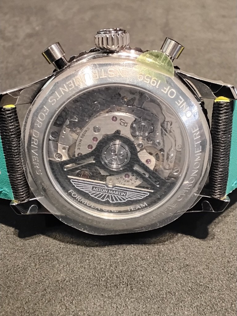 Γυρίζοντάς το από την πίσω πλευρά, το διάφανο καπάκι σου επιτρέπει να δεις τον μηχανισμό σε λειτουργία. Ο μαύρος ρότορας με το λογότυπο της Aston Martin Aramco Formula One Team προσθέτει μια όμορφη λεπτομέρεια που θυμίζει τη συνεργασία, χωρίς να γίνεται υπερβολικός.