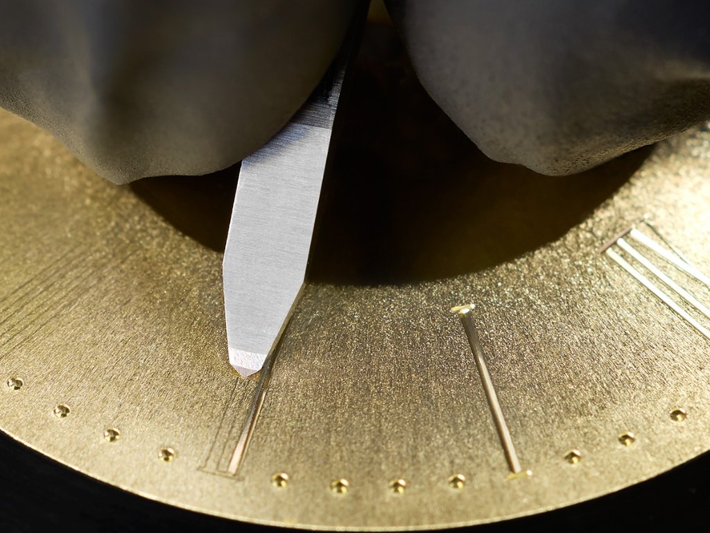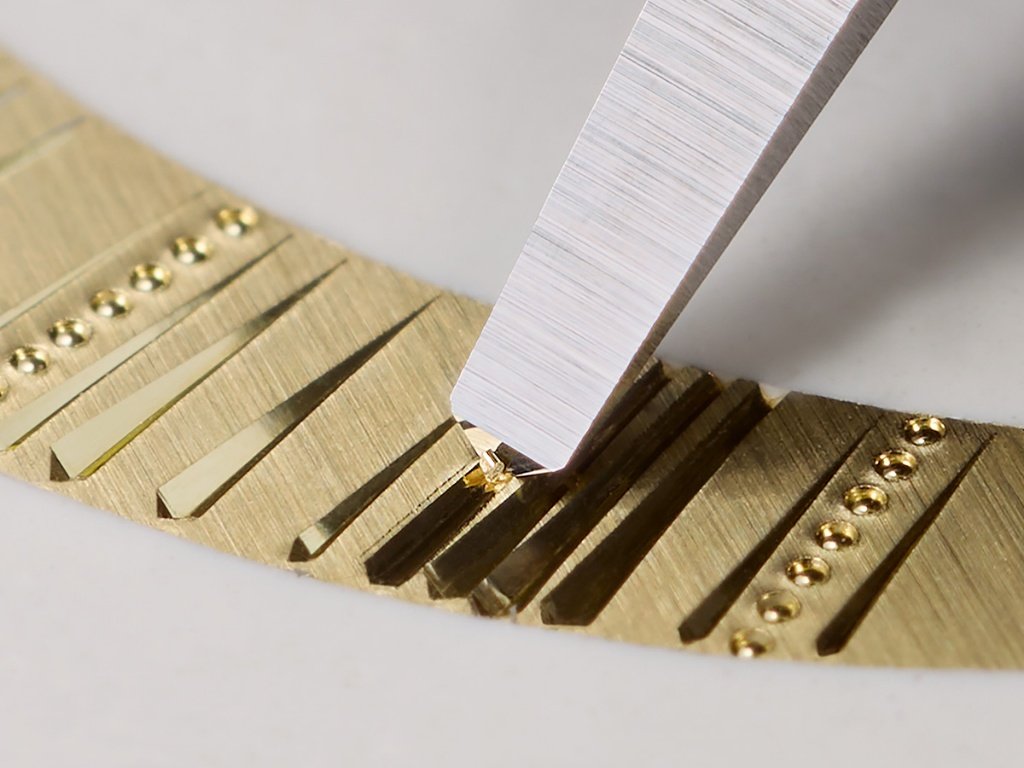 Το καντράν διαθέτει χαραγμένο ένα ακτινωτό μοτίβο που του δίνει μια λεία, σατινέ υφή. Αυτή η περίπλοκη υφή ακτινοβολεί από το κέντρο προς τον εξωτερικό δακτύλιο. Οι λατινικοί αριθμοί δεν είναι τυπωμένοι, αλλά σμιλεμένοι απευθείας πάνω στο μέταλλο, ενώ στην περιφέρεια των λεπτών συναντάμε την παραδοσιακή τεχνική χάραξης nanako, με τις ενδείξεις απεικονίζονται ως μικροσκοπικές κουκκίδες προσθέτοντας μία διακριτική λάμψη.