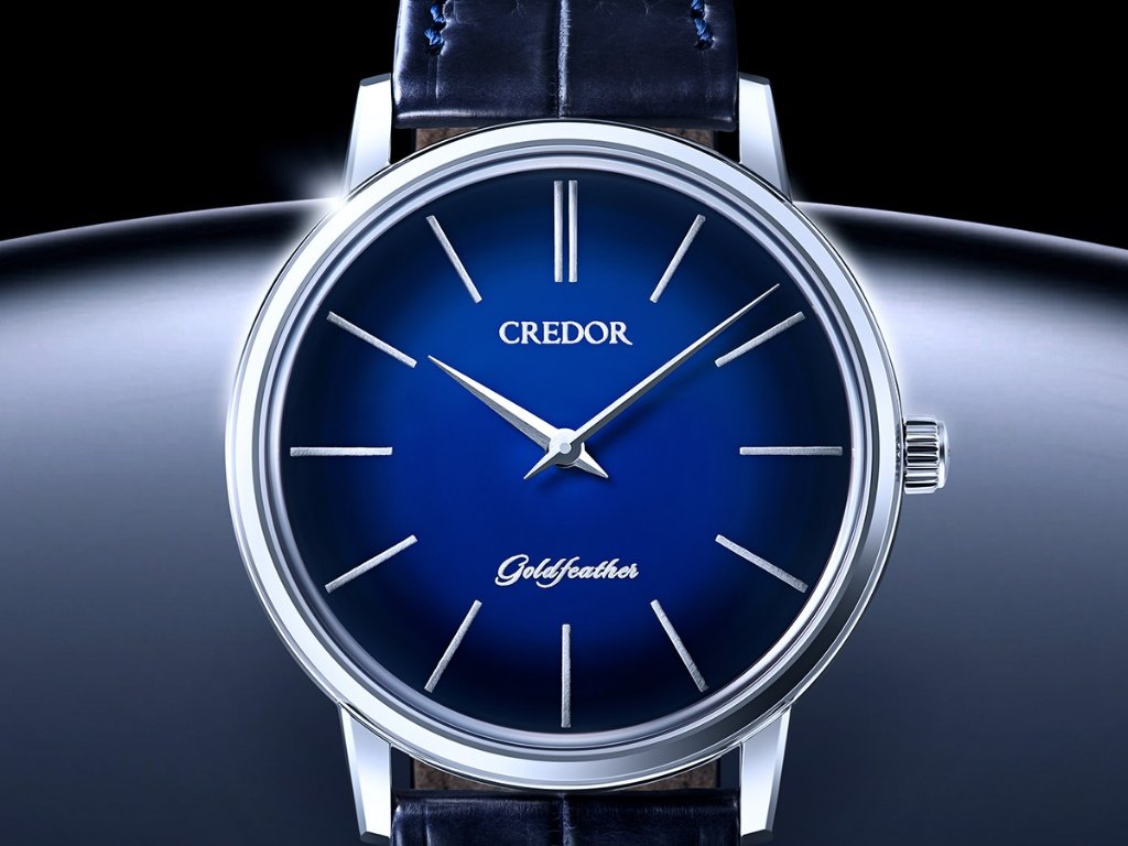 Στη συνέχεια, ακολουθεί το Credor Goldfeather Urushi Lacquer Dial ref. GBBY967, το οποίο είναι ένα ακόμη εξαιρετικό παράδειγμα ιαπωνικής δεξιοτεχνίας. Το κύριο χαρακτηριστικό του είναι το χειροποίητο καντράν με διαβάθμιση, η οποία ξεκινά από ένα βαθύ μπλε στο κέντρο και καταλήγει σε σχεδόν μαύρο στην περιφέρεια.