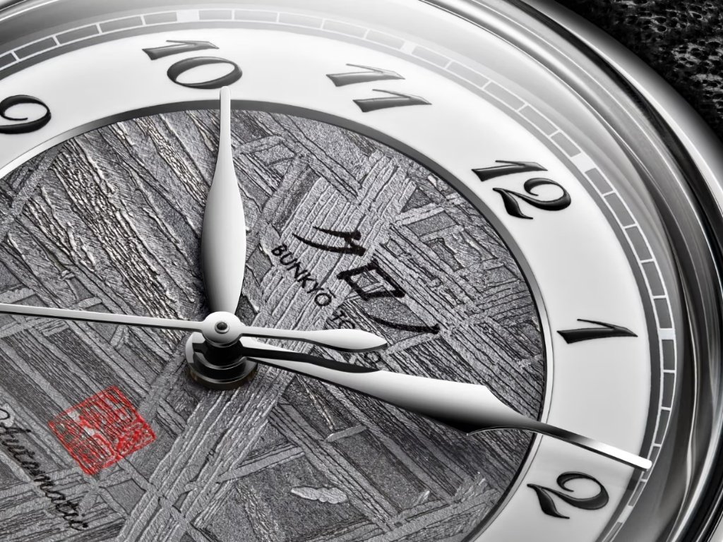 Η Kurono Tokyo, πιστή στη φιλοσοφία του ιδρυτή Hajime Asaoka, δεν αφήνει το υλικό να “φωνάζει”. Το καντράν πλαισιώνεται από λευκό λακαρισμένο εξωτερικό δακτύλιο, δημιουργώντας μια ισορροπημένη bull’s-eye διάταξη που συνδυάζει τη δραματικότητα του μετεωρίτη με την απαραίτητη αναγνωσιμότητα.