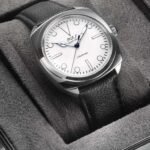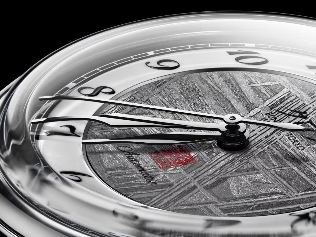 Η Kurono Tokyo, πιστή στη φιλοσοφία του ιδρυτή Hajime Asaoka, δεν αφήνει το υλικό να “φωνάζει”. Το καντράν πλαισιώνεται από λευκό λακαρισμένο εξωτερικό δακτύλιο, δημιουργώντας μια ισορροπημένη bull’s-eye διάταξη που συνδυάζει τη δραματικότητα του μετεωρίτη με την απαραίτητη αναγνωσιμότητα.