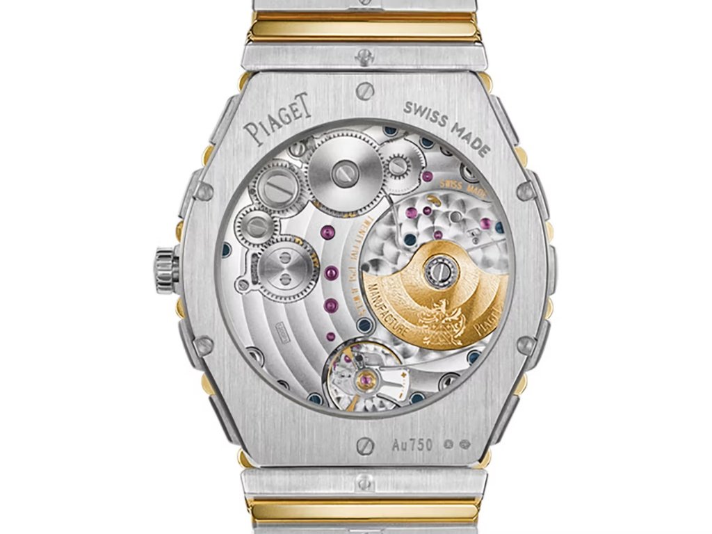Από το διάφανο πίσω μέρος της κάσας μπορεί να θαυμάσει κανείς τον αυτόματο μηχανισμό 1200P1 της Piaget. Με πάχος μόλις 2,35mm, ο μηχανισμός διαθέτει έναν χρυσό μικρό-ρόρτορα, επιλογή που επιτρέπει τη διατήρηση του εξαιρετικά λεπτού προφίλ της κάσας χωρίς συμβιβασμούς στην αυτονομία. Λειτουργεί με συχνότητα 21.600 δονήσεων ανά ώρα (3 Hz) και προσφέρει απόθεμα ισχύος περίπου 44 ωρών.