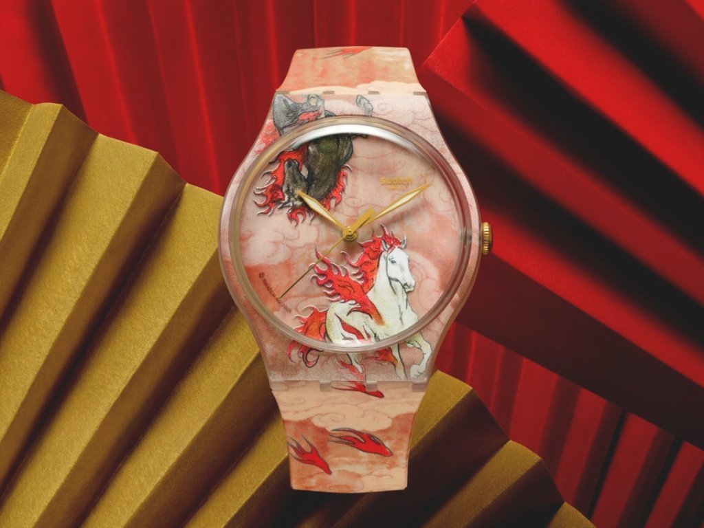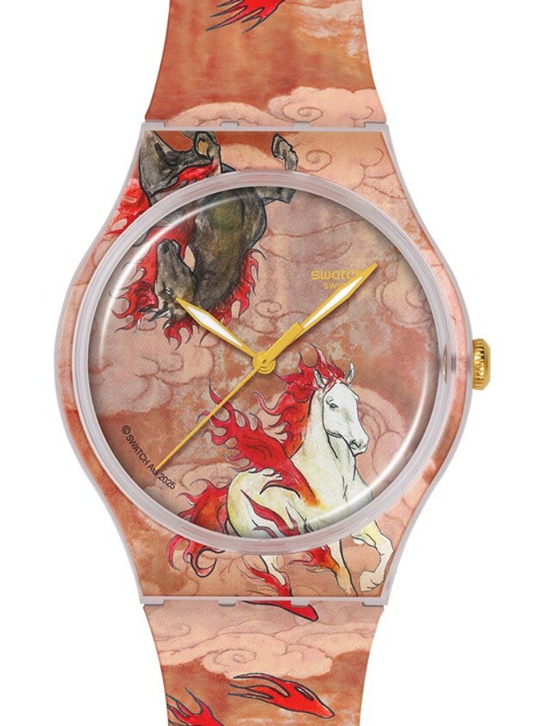 Το RIDING THE CLOUDS είναι εμπνευσμένο από τη Χρονιά του Αλόγου και πιο συγκεκριμένα από το Άλογο της Φωτιάς, που έχει φέτος την τιμητική του. Προϊόν της συνεργασίας με τον καλλιτέχνη Yu Wenjie, πρώην καλλιτεχνικό επιμελητή του Swatch Art Peace Hotel, αυτό το ξεχωριστό ρολόι είναι ένας ύμνος στη δυναμική ενέργεια και μια καθημερινή υπενθύμιση να λάμπεις χωρίς όρια.