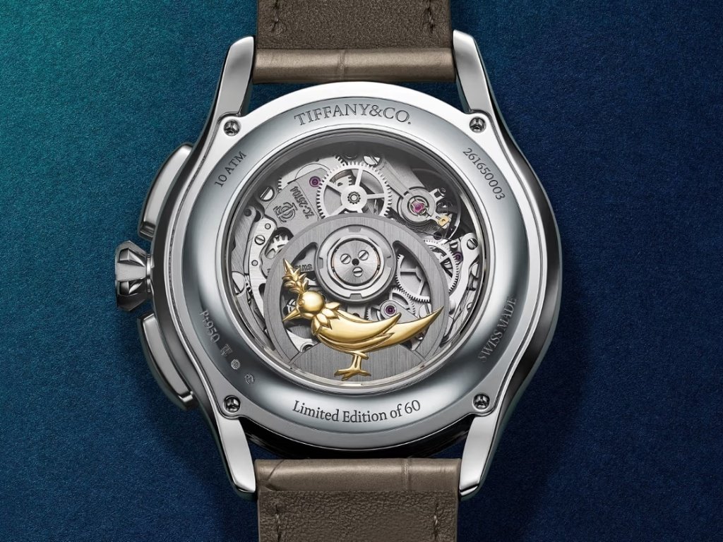 Ορατός μέσα από το διάφανο πίσω κρύσταλλο, ο μηχανισμός διακρίνεται για τον ειδικά διακοσμημένο ρότορα, ο οποίος φέρει το εμβληματικό μοτίβο “Bird on a Rock” σε 18 καρατίων κίτρινο χρυσό. Η λεπτομέρεια αυτή συνδέει άμεσα τη μηχανική καρδιά του ρολογιού με το σχεδιαστικό DNA της Tiffany & Co.