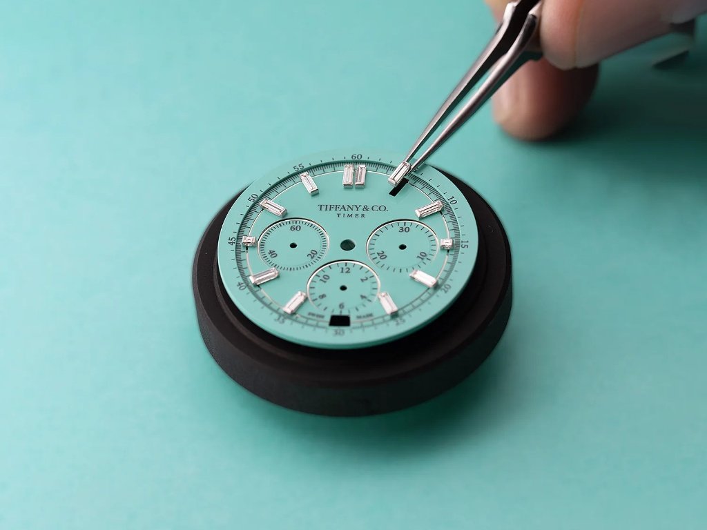 Το καντράν διαθέτει κλασική διάταξη χρονογράφου με ισορροπημένα υποκαντράν και καθαρή ιεράρχηση πληροφοριών, παραπέμποντας άμεσα στα ιστορικά stopwatches του 19ου αιώνα. Οι δείκτες των ωρών είναι κατασκευασμένοι από baguette-cut διαμάντια, τοποθετημένα με ακρίβεια, στοιχείο που αναδεικνύει τη μακρά εξειδίκευση της Tiffany & Co. στην τέχνη της τοποθέτησης πολύτιμων λίθων. Η τυπογραφία είναι λιτή και λειτουργική, χωρίς περιττά διακοσμητικά στοιχεία, ενώ η εξωτερική κλίμακα χρονομέτρησης ενισχύει τον εργαλειακό χαρακτήρα του ρολογιού.