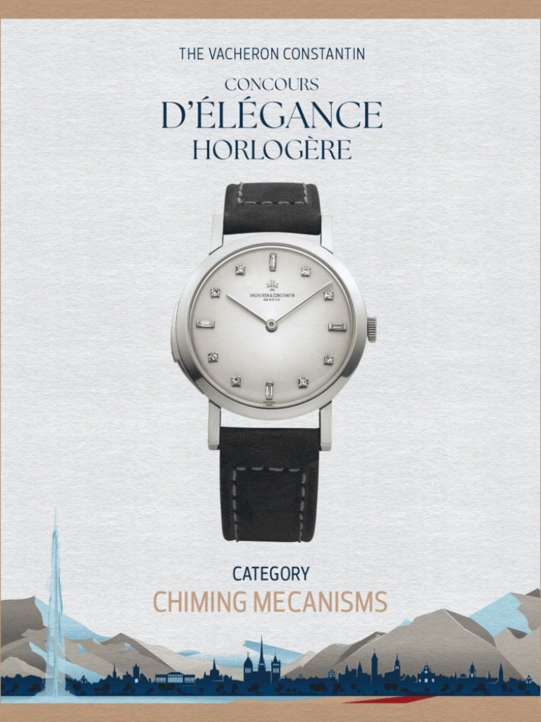 Όσον αφορά τις επτά κατηγορίες του Vacheron Constantin Concours d’Élégance, η δομή τους αντανακλά με ακρίβεια την ιστορική και τεχνική πολυμορφία της μανουφακτούρας. Η αφετηρία γίνεται με τη βράβευση των μηχανισμών ηχητικής σήμανσης, μια κατηγορία αφιερωμένη σε ρολόγια εξοπλισμένα αποκλειστικά με minute repeater, quarter repeater, half-quarter repeater ή grande sonnerie.