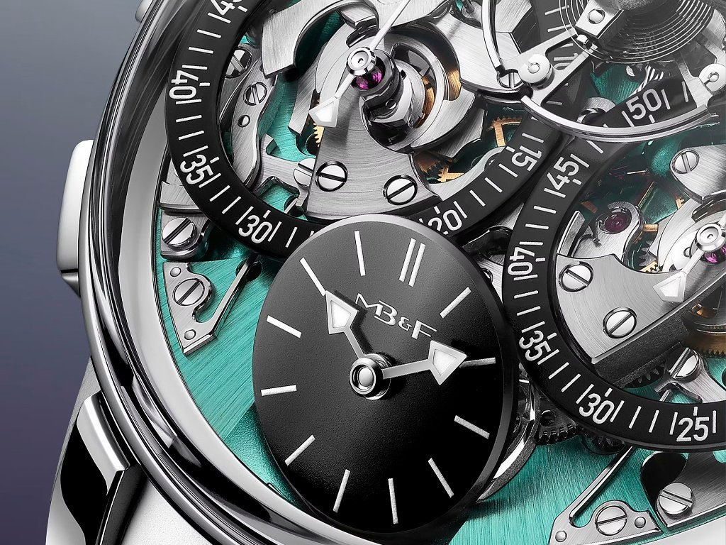 Πάνω από τους τέσσερις μετρητές δεσπόζει ο εμβληματικός αιωρούμενος τροχός ισορροπίας, ένα από τα πιο αναγνωρίσιμα στοιχεία της MB&F. Η τρισδιάστατη αυτή παρουσία δεν λειτουργεί απλώς ως οπτικό εντυπωσιασμό, αλλά ως υπενθύμιση ότι εδώ ο μηχανισμός πρωταγωνιστεί και μετατρέπει το καντράν σε ένα ζωντανό μηχανικό σκηνικό. Κάτω από αυτόν, ο μαύρος, κεκλιμένος δίσκος ωρών και λεπτών με φωτεινούς δείκτες συνδυάζει θεατρικότητα και πρακτικότητα με μοναδικό τρόπο.
