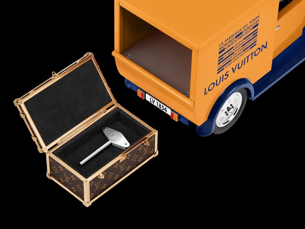 Στο πίσω μέρος του Camionnette, δεσπόζει ένα μικροσκοπικό μπαούλο στον εμβληματικό καμβά Monogram. Πιστό στην κληρονομιά του Οίκου, το μπαούλο αυτό δεν είναι διακοσμητικό. Στο εσωτερικό του φιλοξενείται το κλειδί κουρδίσματος του ρολογιού, ενσωματώνοντας το πιο εμβληματικό σύμβολο της Louis Vuitton στην ίδια τη λειτουργία του χρόνου.