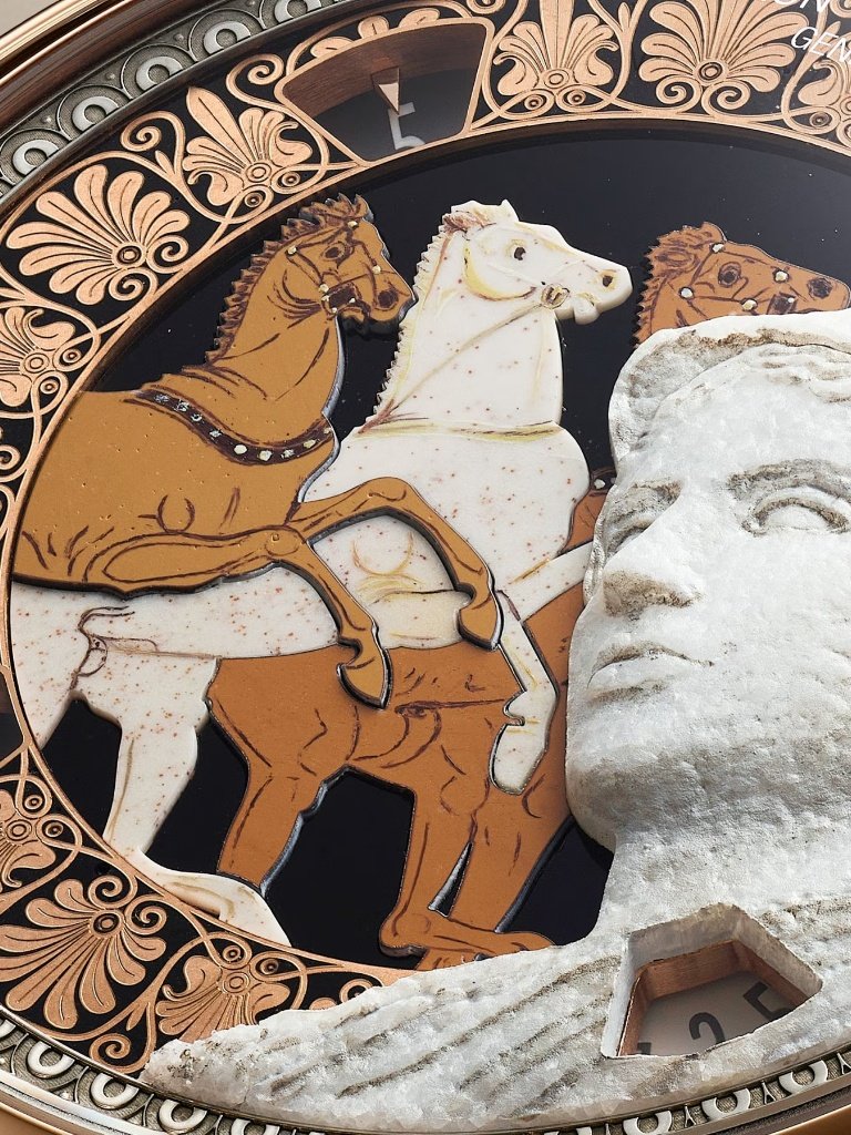 Το Athéna de Velletri αποτυπώνει την ιδεώδη ομορφιά της Αρχαίας Ελλάδας μέσα από το πρόσωπο της θεάς Αθηνάς, σκαλισμένη από μάρμαρο Πάρου με χειροποίητη πατίνα. Τοποθετημένο σε χρυσό καντράν διακοσμημένο με σμάλτο, το έργο πλαισιώνεται από έναν έντονο μαύρο διακοσμητικό δακτύλιο σε τεχνική champlevé, ενώ εξωτερικά αναπτύσσεται μια ακόμη διακοσμητική ζώνη από λευκόχρυσο 18 καρατίων, εμπνευσμένη από μια διονυσιακή σκηνή. Στο κέντρο της σύνθεσης, τα άλογα αποδίδονται με μια πέτρινη σύνθεση μαρκετερί, εμπνευσμένη από έναν ελληνικό αμφορέα από τη Μήλο που χρονολογείται από τα τέλη του 5ου αιώνα π.Χ..