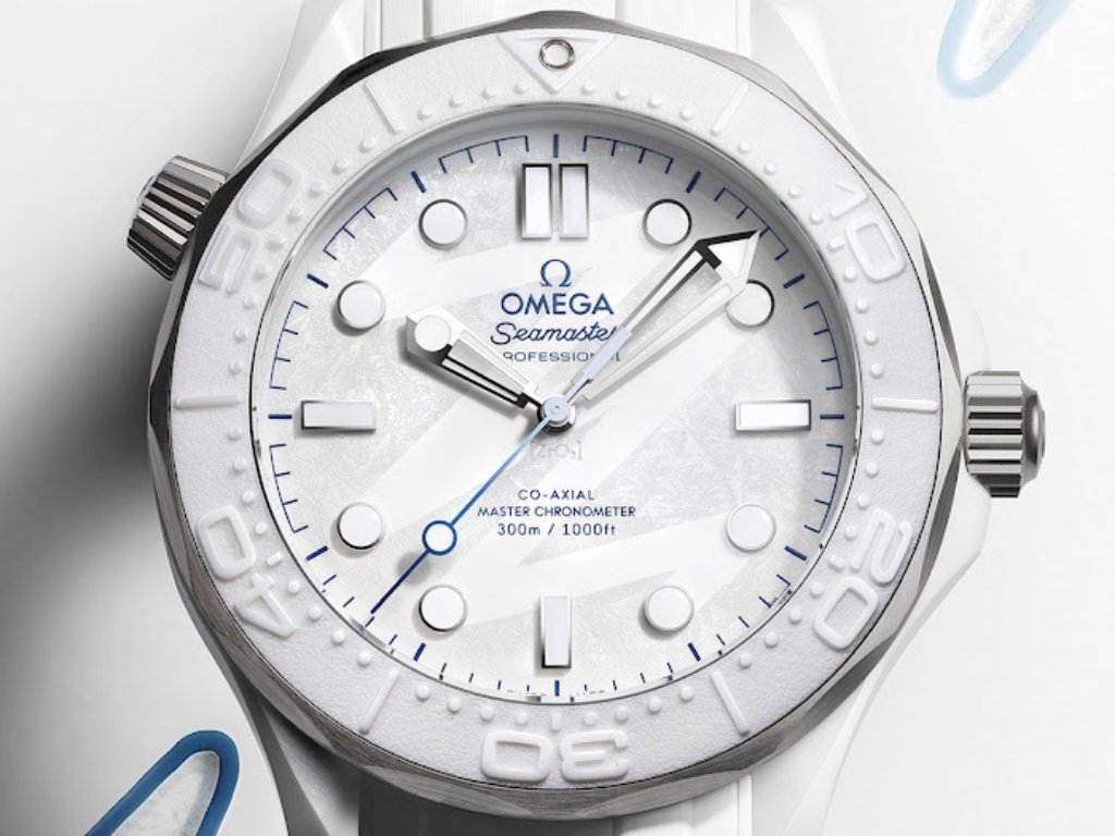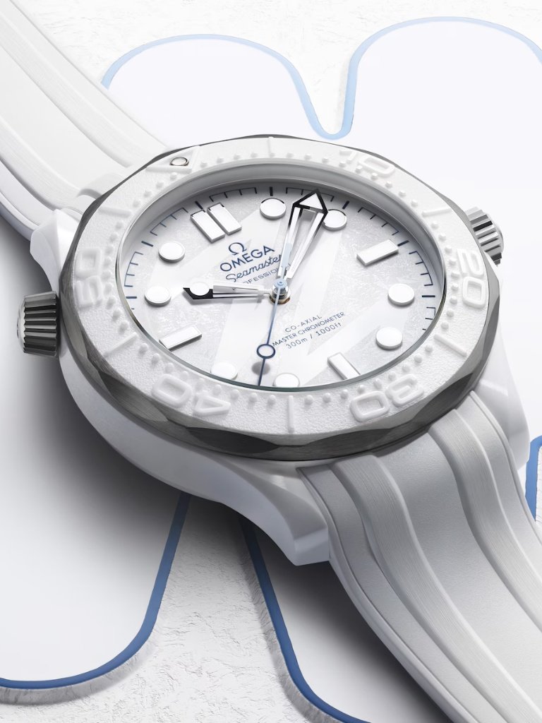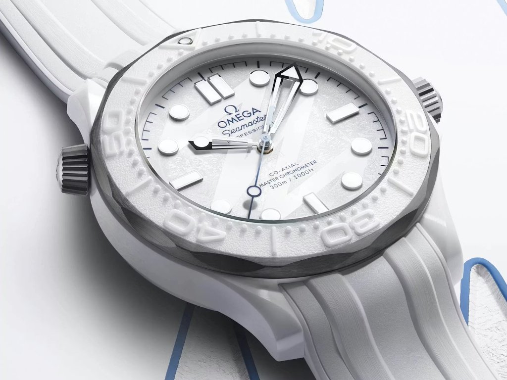 Για να αποδοθεί η χειμερινή έμπνευση, η OMEGA κατασκεύασε το ρολόι από λευκό κεραμικό και τιτάνιο βαθμού 5 – δύο υλικά που συνδυάζουν εκλεπτυσμένη αισθητική με χαμηλό βάρος και υψηλή αντοχή. Τα υλικά αυτά έχουν υποστεί διαφορετικές επεξεργασίες φινιρίσματος, δημιουργώντας έντονες αντιθέσεις στις επιφάνειες του σχεδιασμού. Στο σώμα της κάσας παρατηρείται εναλλαγή γυαλισμένων και βουρτσισμένων επιφανειών, ενώ η βαλβίδα διαφυγής ηλίου και η κορώνα φέρουν αμμοβολή.