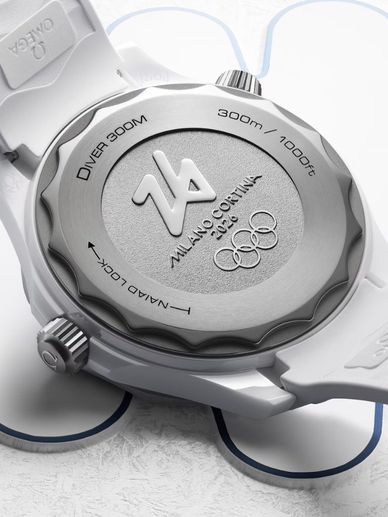 Στο καπάκι της κάσας από τιτάνιο βαθμού 5, η OMEGA έχει ενσωματώσει ανάγλυφο το έμβλημα Milano Cortina 2026, υπογραμμίζοντας τη σύνδεση του μοντέλου με τους XXV Χειμερινούς Ολυμπιακούς Αγώνες.