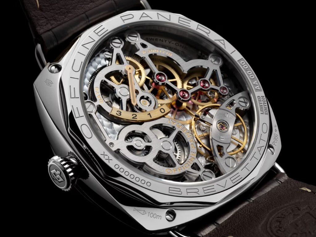 Το χαρακτηριστικό μαύρο Sandwich καντράν της μάρκας με κυκλικό βουρτσισμένο φινίρισμα αποπνέει διακριτική αυστηρότητα. Η σχεδιαστική λιτότητα ενισχύεται από τον διακοσμημένο μηχανισμό P.3001/10, ορατό από το πίσω μέρος, με σκελετωμένες γέφυρες και ένδειξη αποθέματος ισχύος. Εδώ, η Panerai δεν ανατρέχει απλώς στην ιστορία της – την επαναπροσδιορίζει μέσα από τη μηχανική της δεξιοτεχνία.