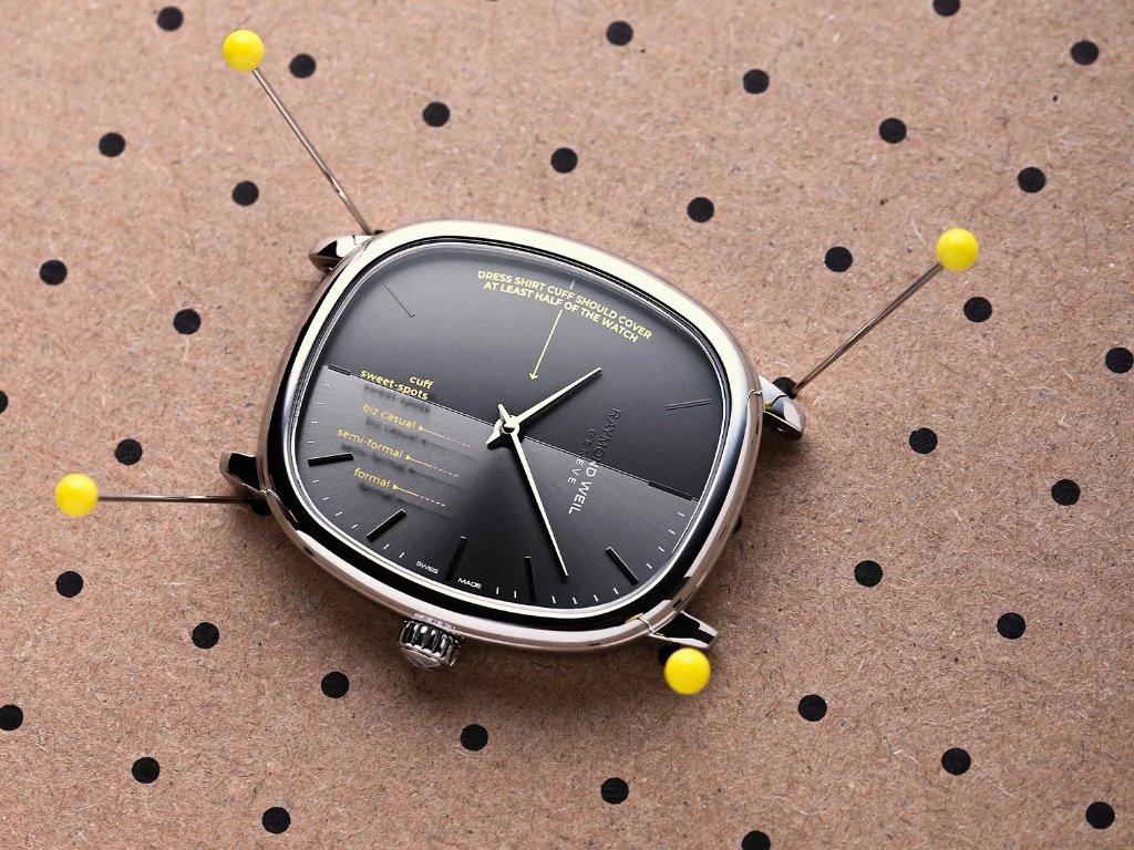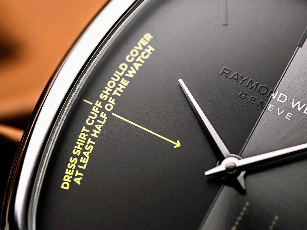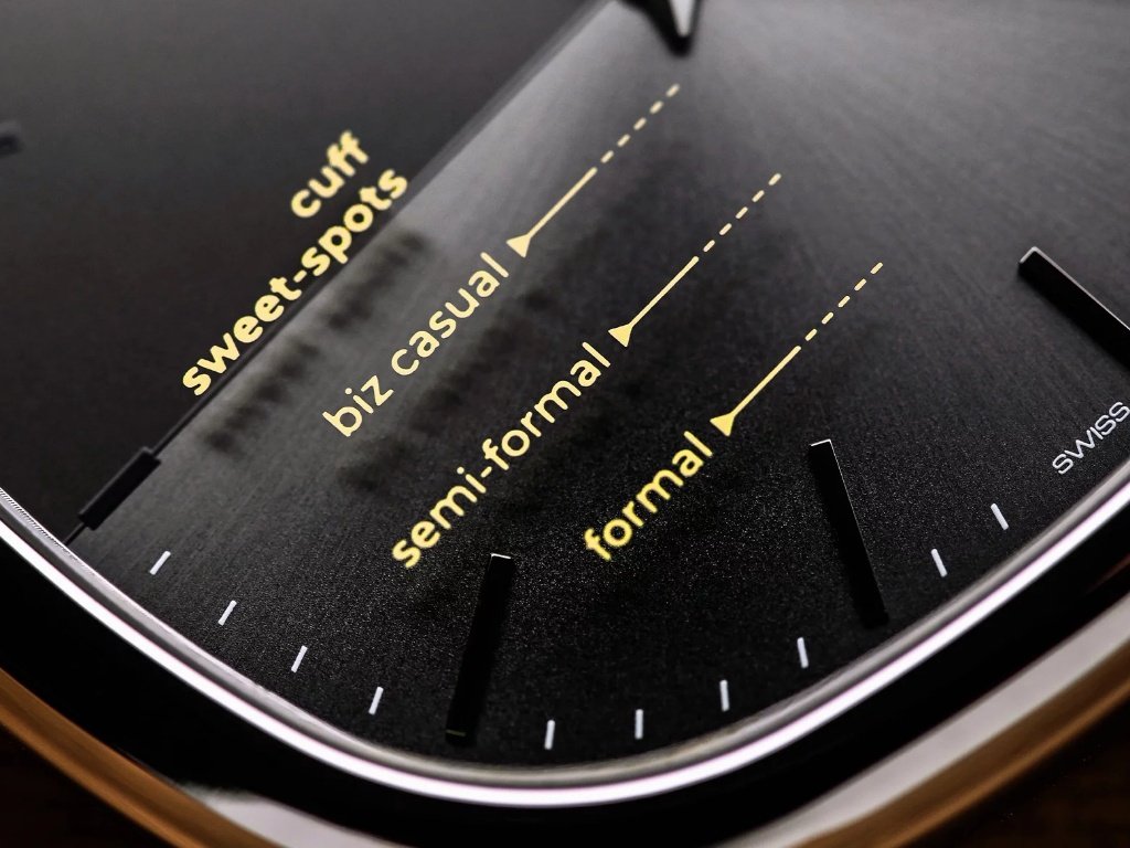 Παράλληλα, στο καντράν υπάρχουν και δευτερεύουσες λεκτικές παρεμβάσεις, επισημαίνοντας το σημείο που πρέπει να κάθεται η μανσέτα, σε περίπτωση που είστε ντυμένοι επαγγελματικά, ημιεπίσημα ή επίσημα. Η διάταξη των γραφικών, οι αντιθέσεις στην υφή του καντράν και η προσεκτική επιλογή χρώματος ενισχύουν την αίσθηση ότι τίποτα δεν βρίσκεται εκεί τυχαία.
