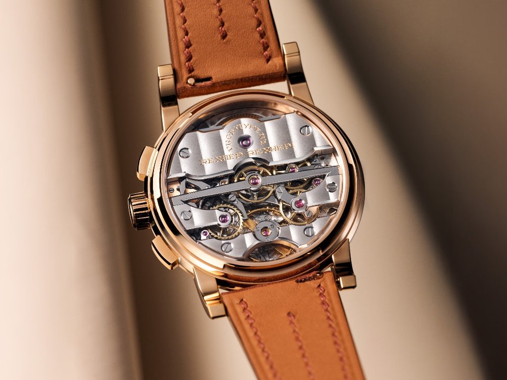 Πάμε τώρα και στην πραγματική ουσία του RRCHF. Στο εσωτερικό βρίσκεται ένας εντελώς νέος, πλήρως in-house μηχανισμός, σχεδιασμένος τα τελευταία τέσσερα χρόνια από τον ίδιο τον Rexhepi. Πρόκειται για έναν χειροκίνητο χρονογράφο με λειτουργία flyback, ο οποίος επιτρέπει την άμεση επαναφορά και επανεκκίνηση με ένα μόνο πάτημα. Η λειτουργία αυτή, αν και φαινομενικά απλή, απαιτεί εξαιρετική ακρίβεια στην κατασκευή και στον συγχρονισμό των επιμέρους εξαρτημάτων.