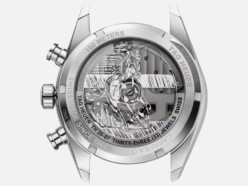 Το πίσω μέρος της κάσας από ζαφείρι αποκαλύπτει τον μηχανισμό Calibre TH20-07 με απόθεμα ισχύος 80 ωρών, συμβολίζοντας την απεριόριστη ενέργεια και γιορτάζοντας το αγωνιστικό πνεύμα.