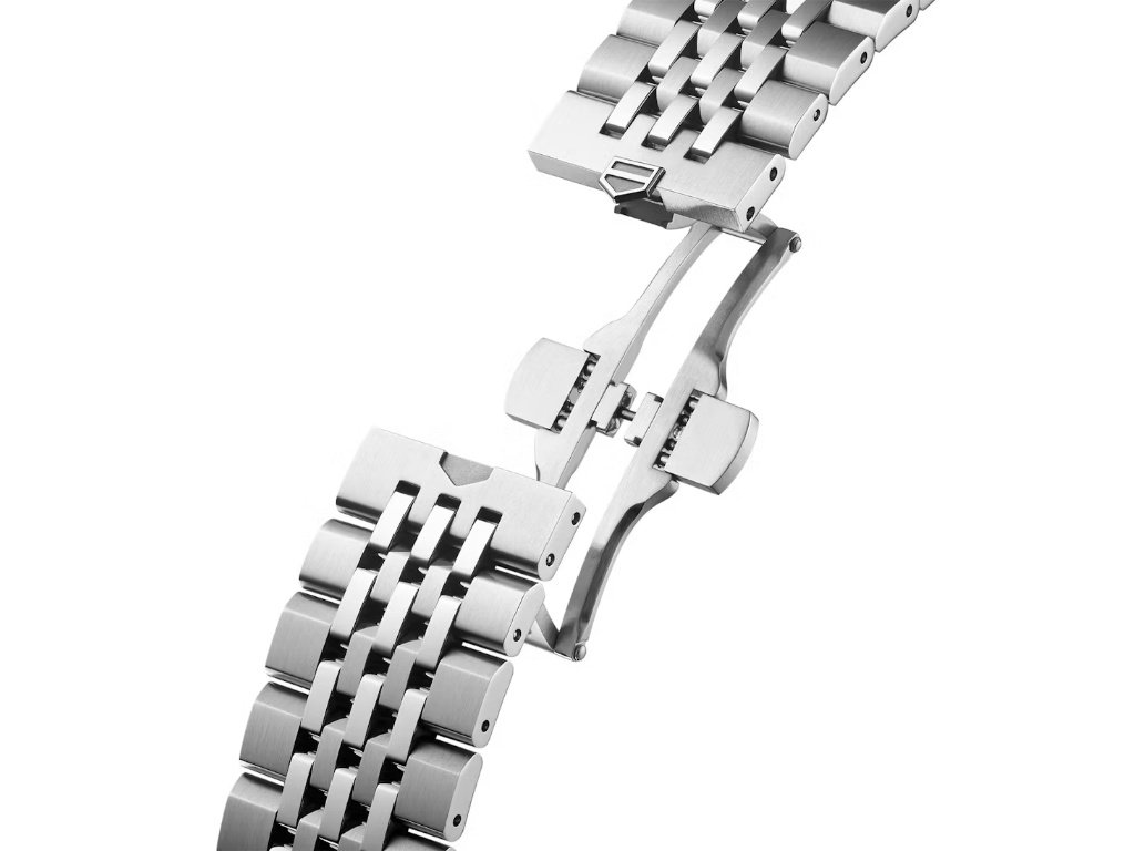 Το μπρασελέ επτά συνδέσμων με butterfly κούμπωμα ολοκληρώνει τη σύγχρονη εικόνα του ρολογιού, προσφέροντας άνεση και σωστή κατανομή βάρους στον καρπό. Ένα διακριτικό αλλά ενδιαφέρον στοιχείο αποκαλύπτεται στο πίσω μέρος: στον κάτω δεξιό βραχίονα της κάσας είναι χαραγμένο το “Στεφάνι Νίκης”, ένα σύμβολο που παραπέμπει τόσο στη μακρά σχέση της μάρκας με τον μηχανοκίνητο αθλητισμό όσο και στην έννοια της προσωπικής επιτυχίας.